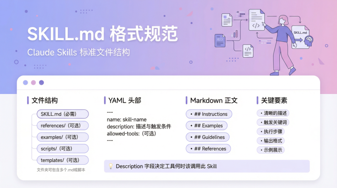 - SKILL.md:定义这个 Skill 的定位与入口,说明怎么触发、整体流程、输入要求、输出目标。 这个可以自己写一个雏形,然后和 AI 工具沟通并优化。