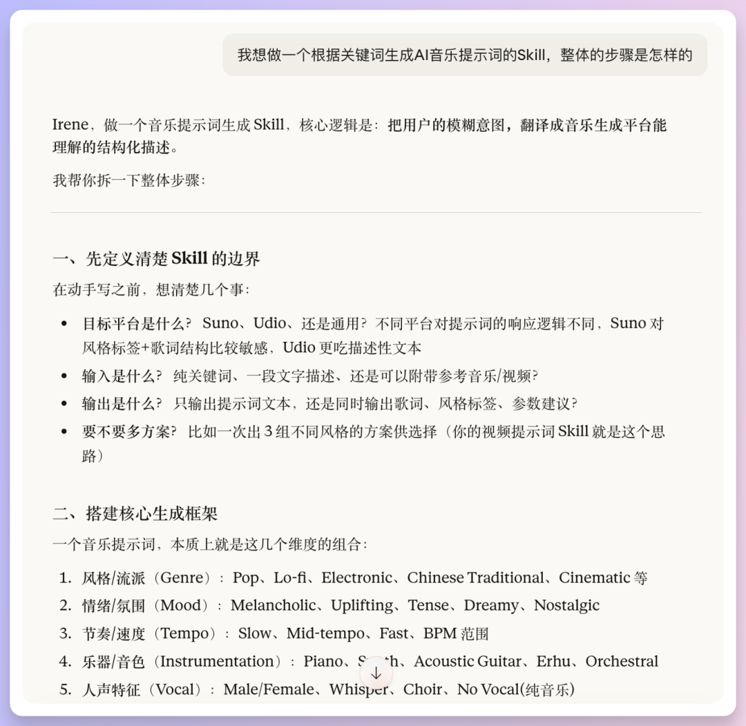 梳理完全部步骤后,就可以输出一个完整的提示词,让 AI 生成 Skill 了。需要详细输出的地方,可以单独生成提示词或模板后放进去,要求脚本调用。