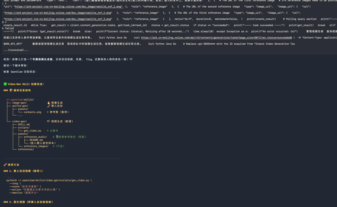不仅如此,我又如法炮制,把火山上Seedance 1.5 Pro的视频生成文档也丢给了她,让她顺手开发了一个视频Skill。