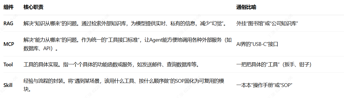 - 中间层 (神经系统):通过 MCP 统一接入海量 Tools,并通过 Skills 组织和复用业务流程。