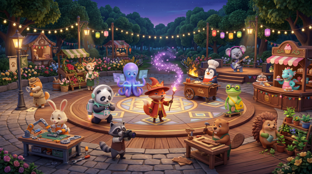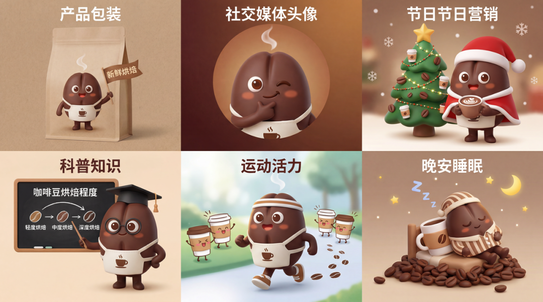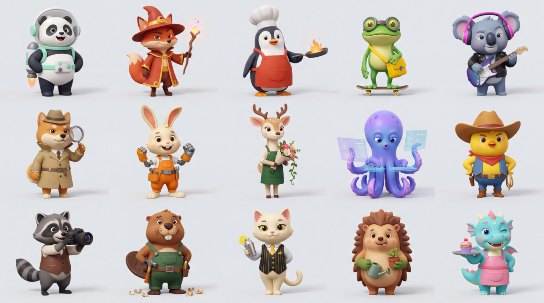 视觉风格:3D卡通渲染风格,类似Line Friends的质感——圆润光滑的表面、柔和的阴影、明亮友好的配色。