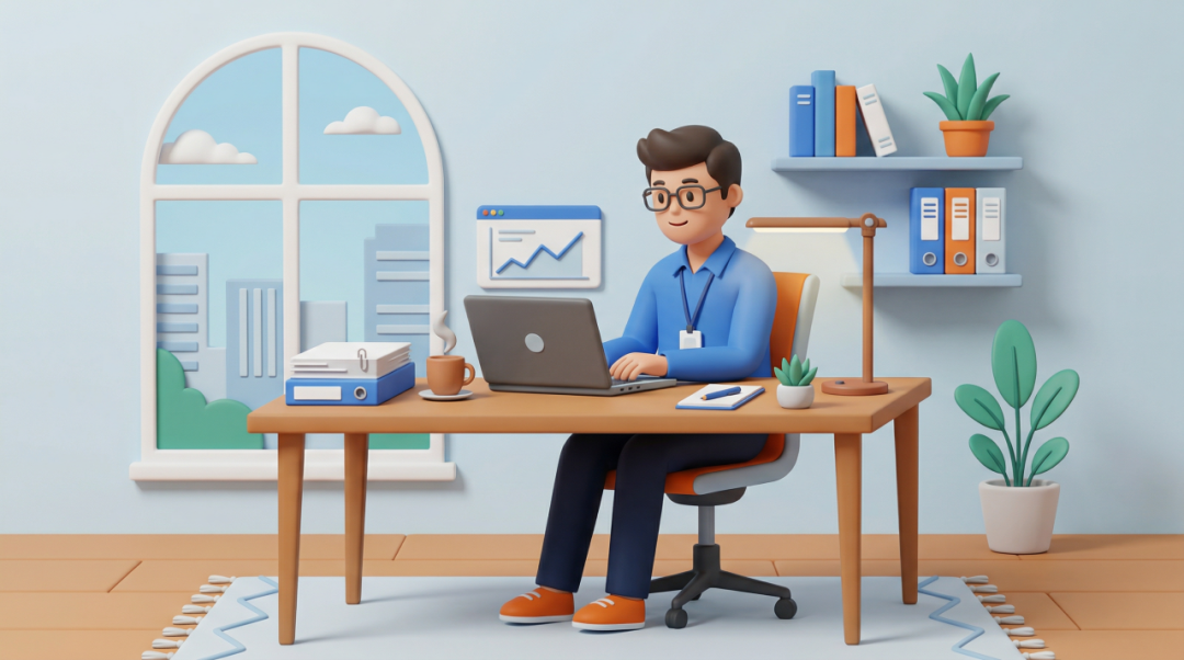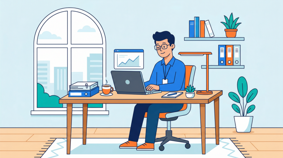 保持画面中的所有元素不变(人物、电脑、咖啡杯、文件、台灯、书架、窗户、绿植),保持整体构图和蓝色+橙色+白色的配色方案不变。