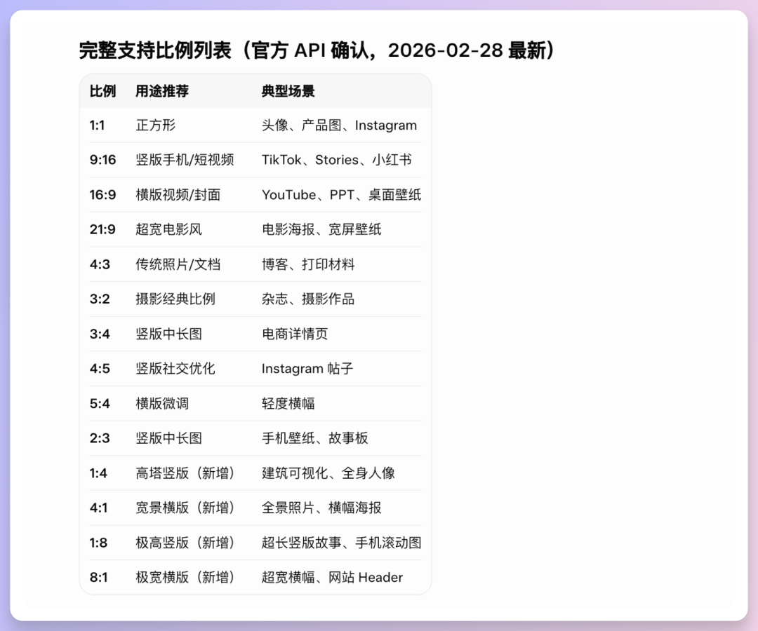 Nano Banana 2 支持 14 种宽高比,分辨率从 512px 到 4K。常见的 9:16、16:9、1:1 自然不用多说,非常有意思的是它现在已经支持 1:4 甚至 1:8 这样的极端长图比例了。以后想要做长图攻略、时间轴信息图、竖版故事条、全景海报,有了更多可能性。