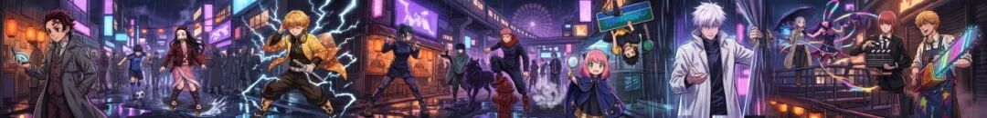 超高审美二次元电影感群像海报,夜色霓虹雨后街区,镜头为24mm广角低机位,前中后景分层清晰,20位日本动漫角色同场但保持各自核心辨识特征,整体美术统一为高对比赛博霓虹+胶片颗粒: