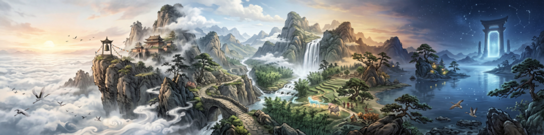 左侧是云海中的悬崖古寺与晨钟薄雾,中段是层叠山谷、飞瀑、古桥、竹林与流光神兽群,右侧是夜色初临的星湖、浮岛与远古天门。