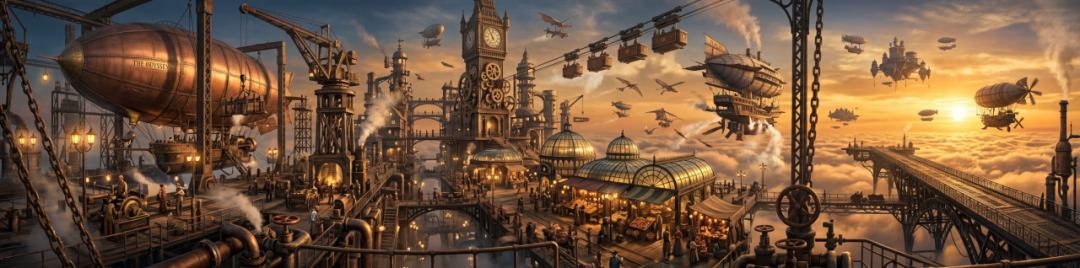 大量动态元素同时发生:飞艇起降、机械信使穿梭、蒸汽阀门喷薄、空中轨道车交错,形成强烈“忙碌文明”叙事。材质重点表现拉丝黄铜、旧化钢铁、皮革、木质甲板、雾化玻璃;