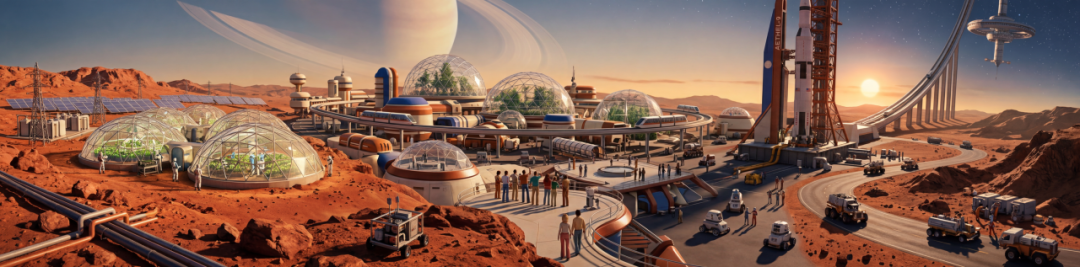 复古未来主义太空殖民地超宽场景,灵感来自七十年代科幻海报但以现代3D渲染完成:左侧是红色荒漠中的圆顶农场与太阳能阵列,中段是主城交通环与透明穹顶生态区,右侧是发射井、轨道电梯基座与远处星环天际线。