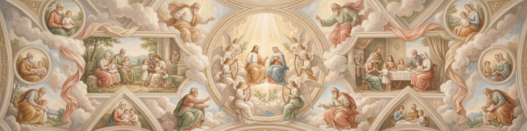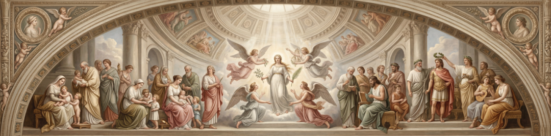 超宽幅文艺复兴宗教神话壁画场景,西斯廷穹顶叙事美学,但整体气质更柔和、更温馨:天穹被分为连续叙事区,中心是温暖神圣之光轻柔洒下,四周环绕天使、先知与人间家庭群像,人物表情平静慈爱,姿态优雅舒展,强调守护、祝福与希望。