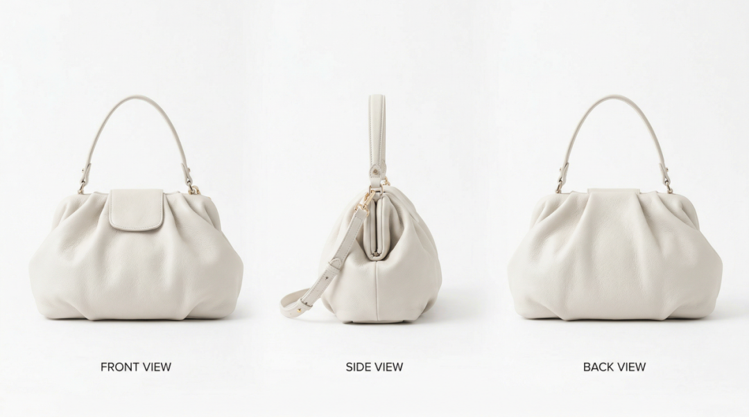 设计感手袋白底三视图,极简云朵包(柔软鼓感轮廓、磁吸开合、短提手+可拆肩带、雾面皮革),一张图横向并列 front side back,白底无缝,镜头一致,棚拍柔光,细节高清,风格清新时髦,适合年轻女性市场
