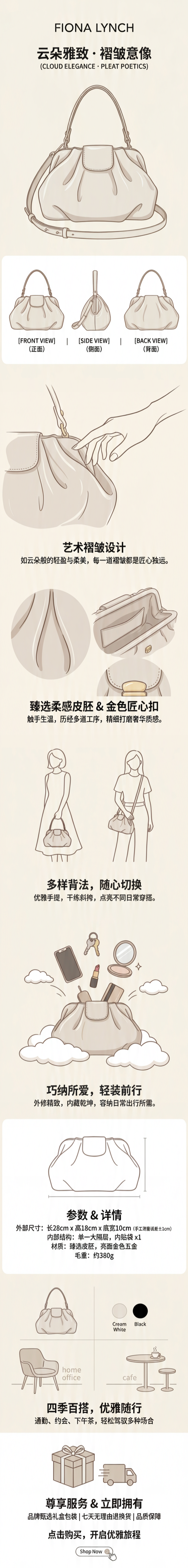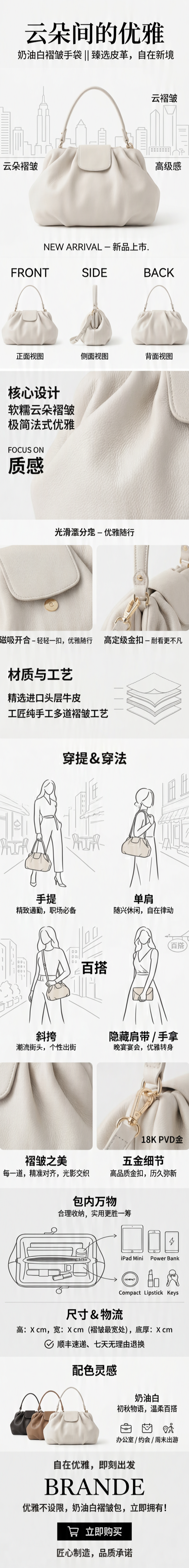 为这款奶油白云朵褶皱女包生成一张中文电商长图详情页: