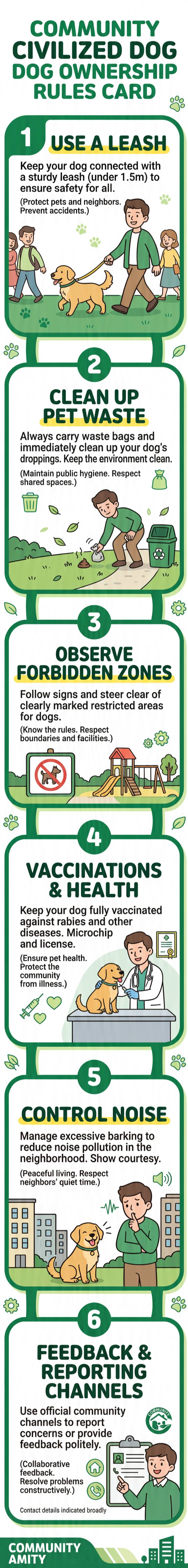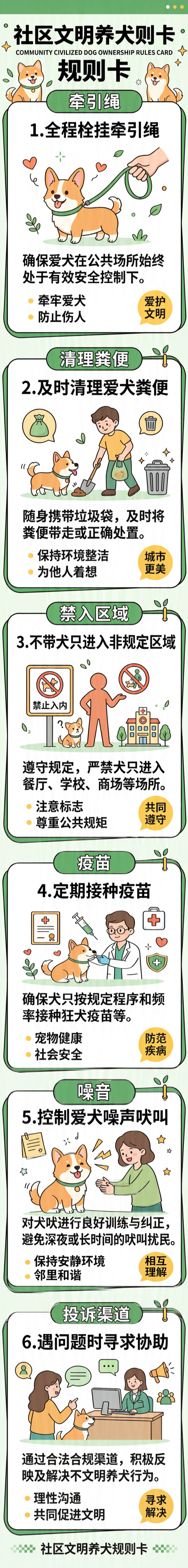 生成《社区文明养犬规则卡》内容结构:(牵引绳、清理粪便、禁入区域、疫苗、噪音、投诉渠道)。