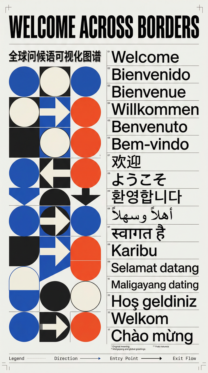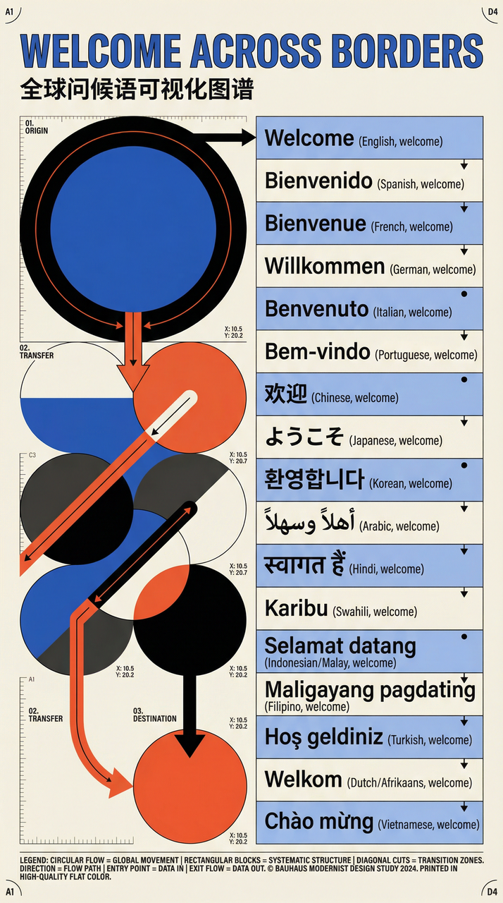 画面目标与主题:多语言欢迎信息图,采用包豪斯现代主义设计感,几何图形与文字共同构建理性又有温度的视觉。