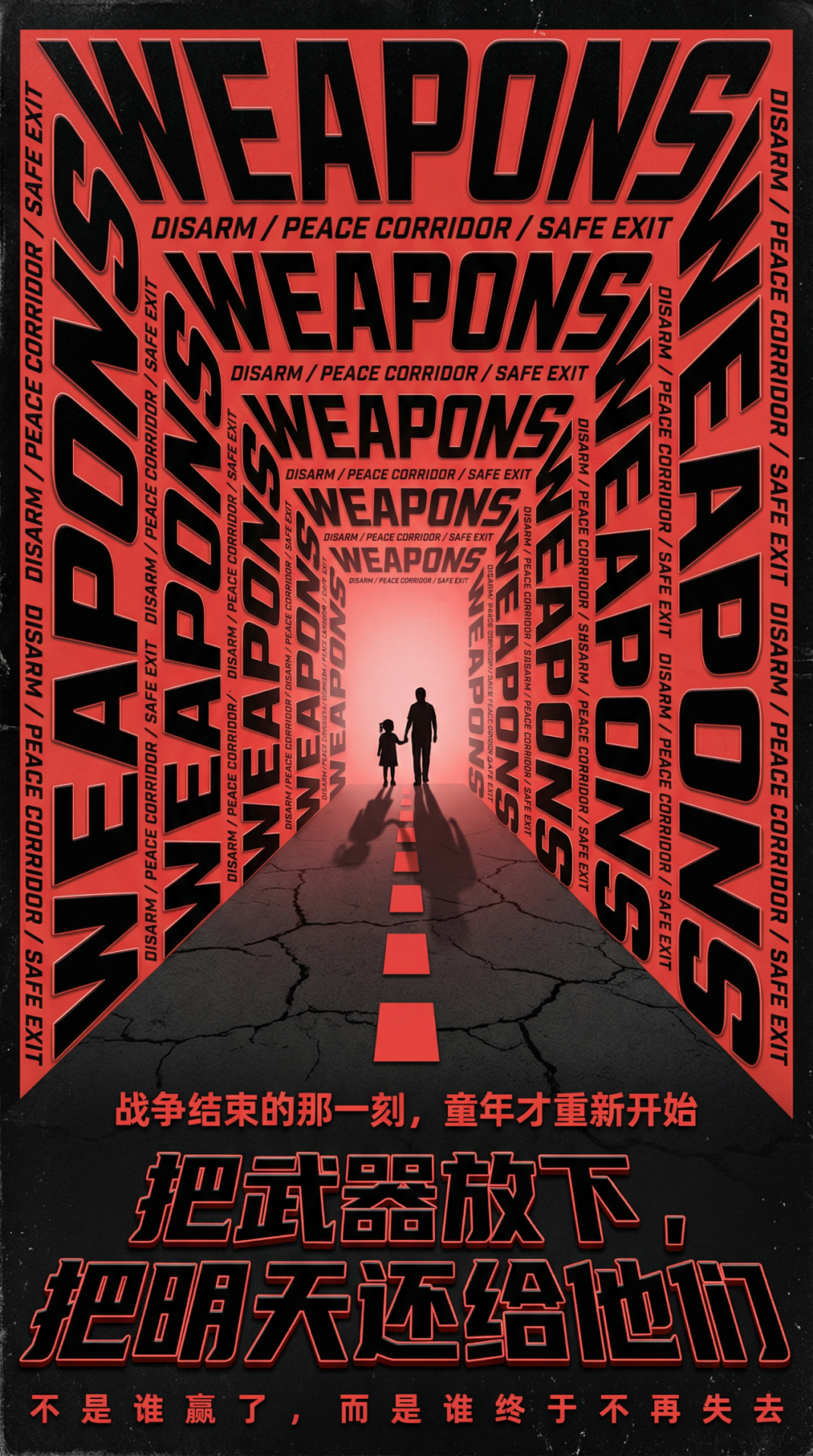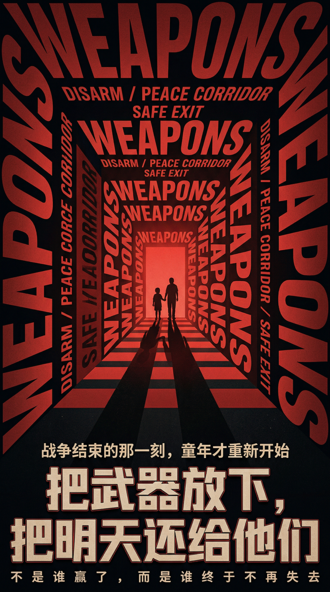上图文字:主标题“把武器放下,把明天还给他们”使用几何无衬线重黑体、厚描边与轻凹凸压印、字号最大、底部居中,副标题“战争结束的那一刻,童年才重新开始”画面中下部居中,说明文字“不是谁赢了,而是谁终于不再失去”使小号、底部单行横排,符号文字“DISARM / PEACE CORRIDOR / SAFE EXIT”使用等宽斜体粗字、透视扭曲连续复制、字号随纵深递减、覆盖顶面与左右墙体;