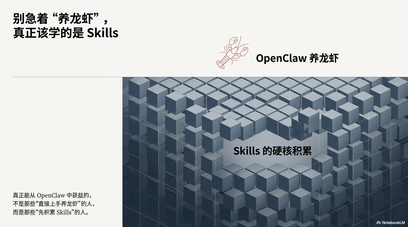 真正能从OpenClaw中获益的,不是那些”直接上手养龙虾”的人,而是那些”先积累Skills”的人。