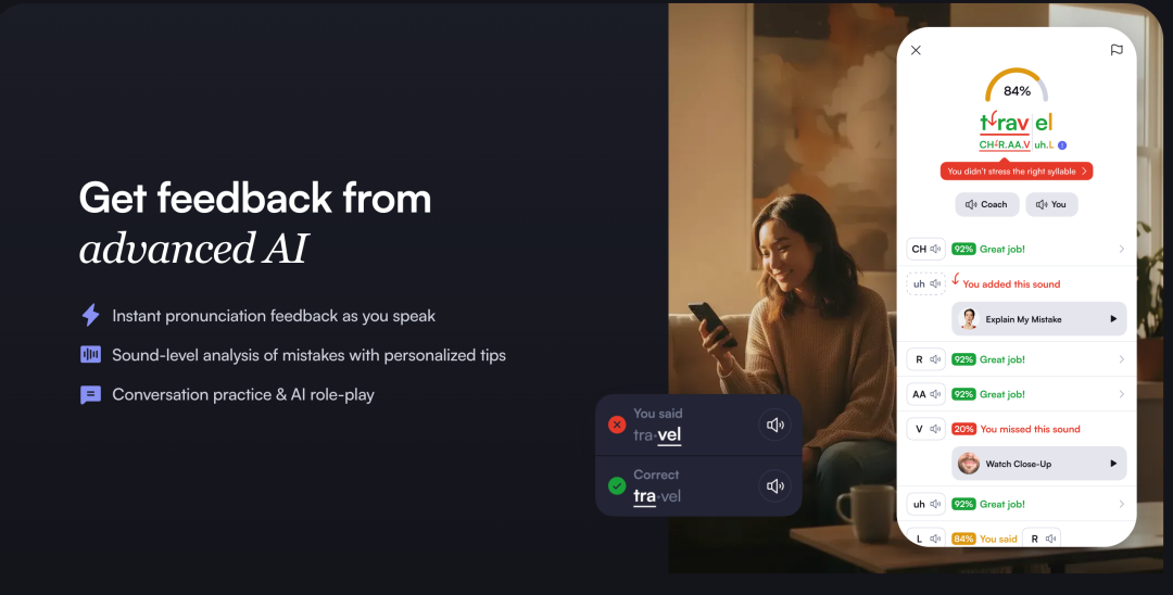 他们的平台结合了两个核心组件。一是来自好莱坞口音教练的视频课程。这些教练会像在一对一课程中那样,详细演示如何移动嘴唇、舌头和下颚来发出特定的声音。他们会讲解每个元音和辅音的发音技巧,展示正确的口型和舌位。这些视频通常只有 5 分钟左右,足够简洁,但又包含了所有必要的信息。二是专有的 AI 语音模型,专门训练来分析口音和发音。当用户录制自己的声音时,AI 会在音素级别进行分析,给出即时的百分比评分,并指出具体哪些音发错了。如果你发错了某个音,系统会提供 30 秒的短视频,教你如何纠正。