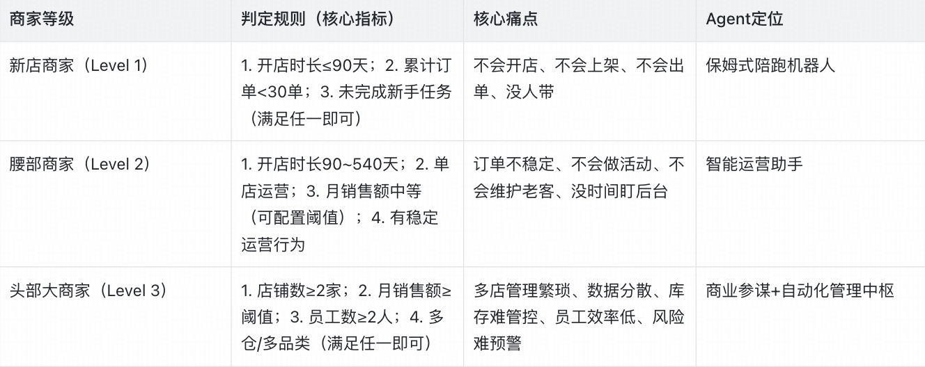 商家AI Agent的设计核心,是“分层”——基于商家的生命周期和规模,设计不同的Agent能力,避免“大而全”,确保每一项能力都能解决商家的真实痛点。以下是经过实战验证的分层设计方案,可直接复用。