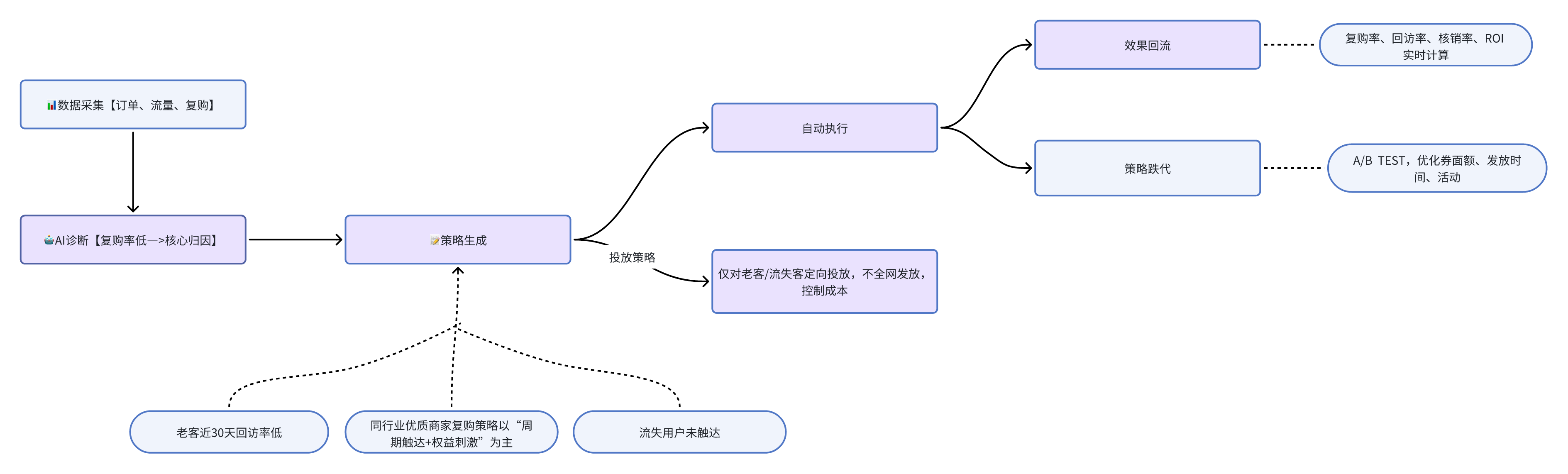 - 每日凌晨自动读取商家经营数据,生成诊断报告,明确指出核心问题:`复购率偏低(12%),主要原因:无老客唤醒活动、无评价引导,活动频次不足`;