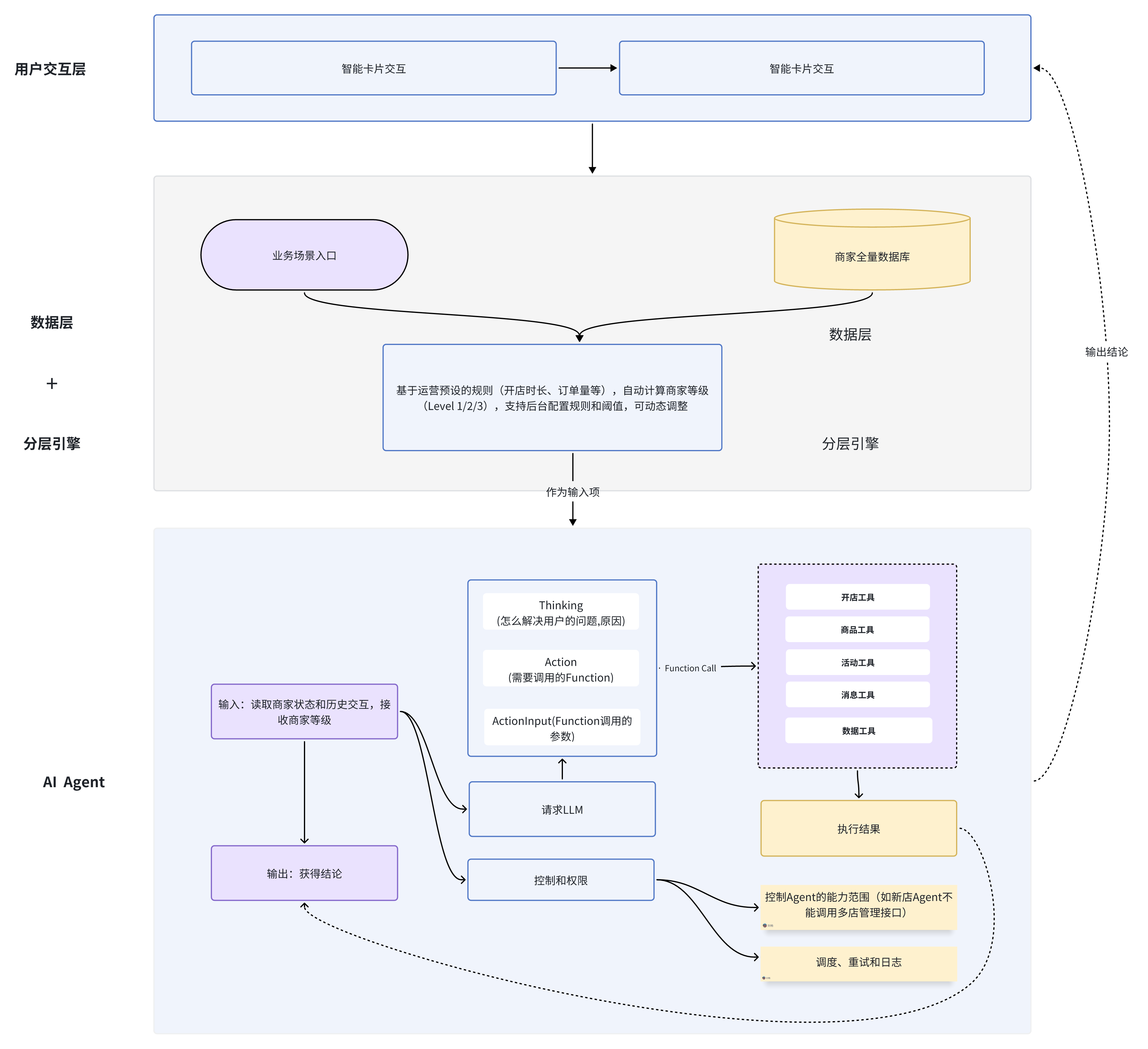 我们的商家AI Agent系统,遵循“Query → LLM思考 → 工具调用 → 结果反馈”的标准Agent执行流程,同时结合商家分层运营的业务特点,形成了如下四层架构: