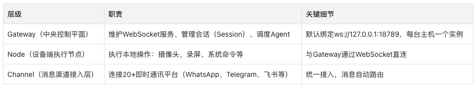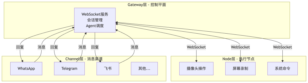 OpenClaw采用Gateway-Node-Channel三层架构,通过WebSocket作为通信总线,将控制、执行和接入三个层面完全解耦。