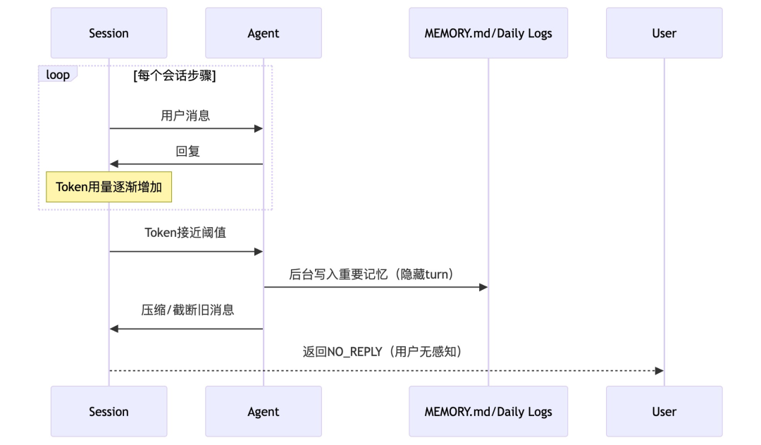 - 压缩上下文:旧消息被压缩或截断,释放Token空间。用户看不到这个过程(返回NO_REPLY)。