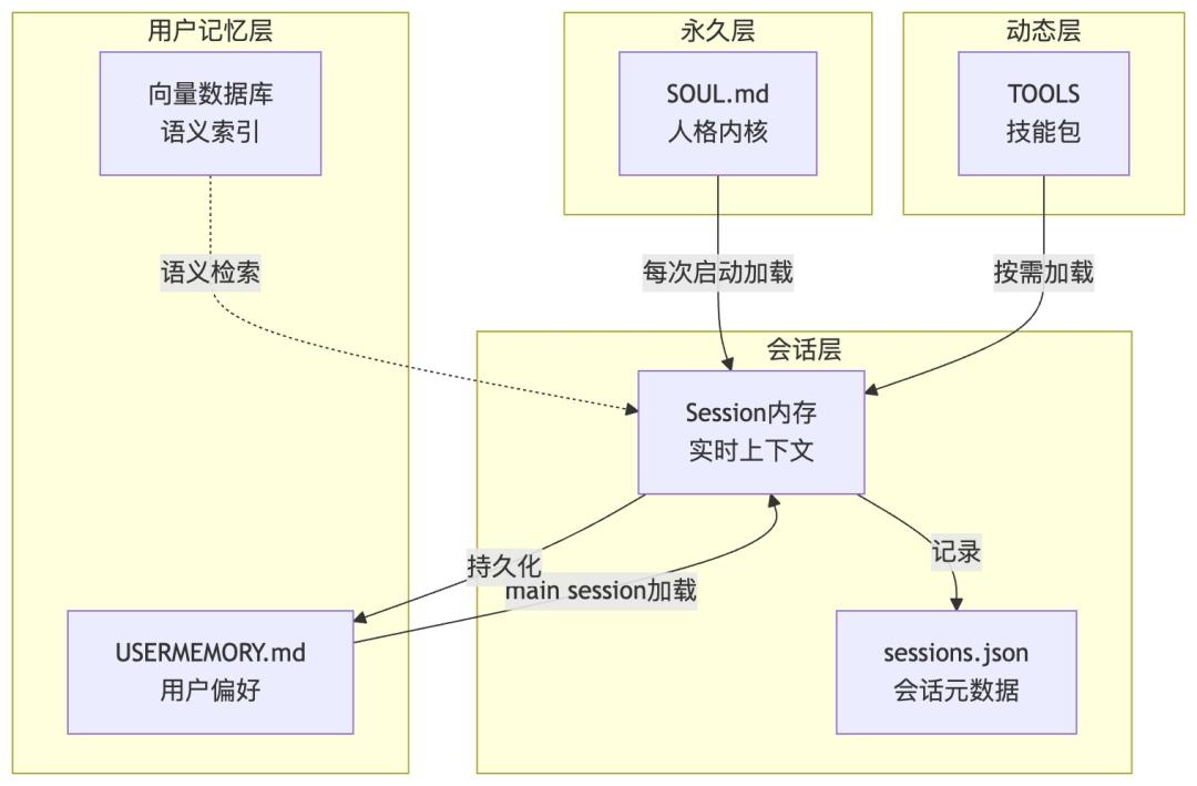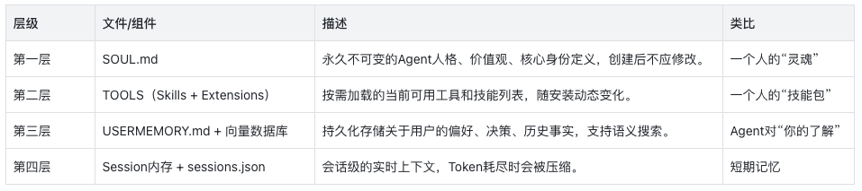OpenClaw的记忆分为四个层次,从永久不变的人格内核到实时对话的短期记忆,构建了完整的上下文连续性。