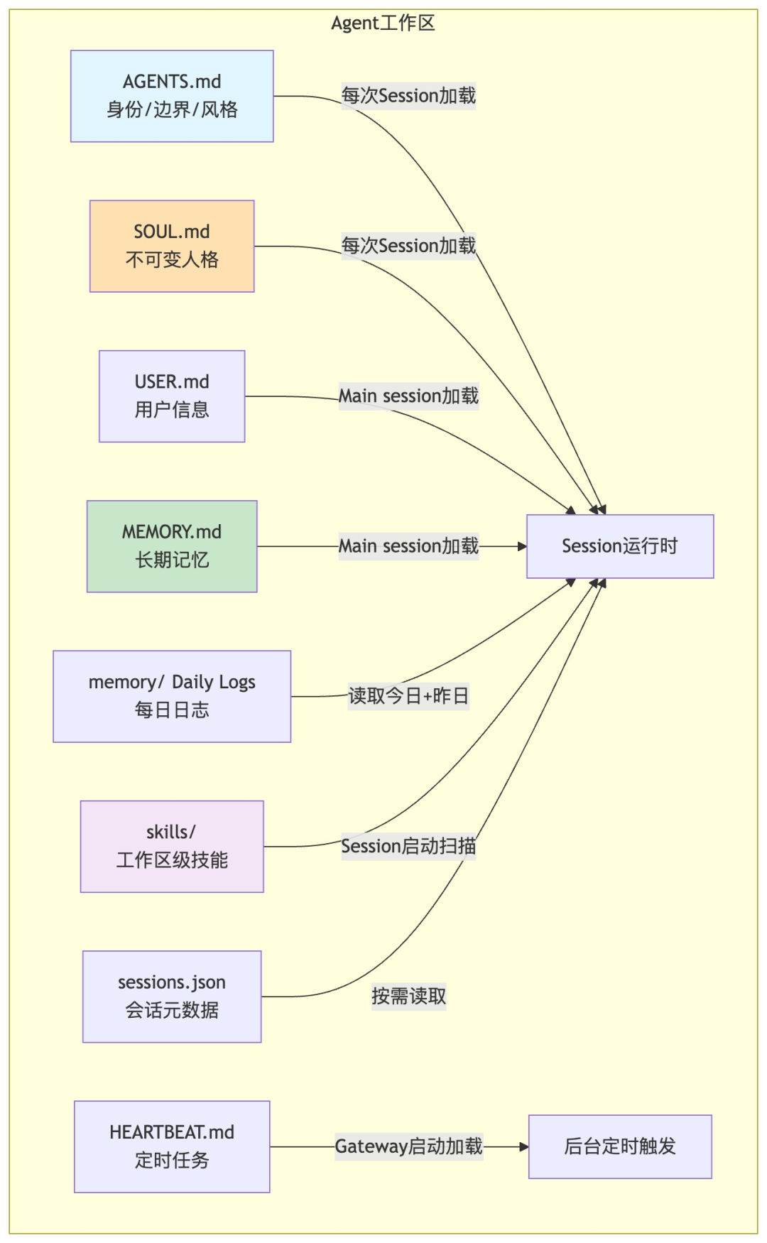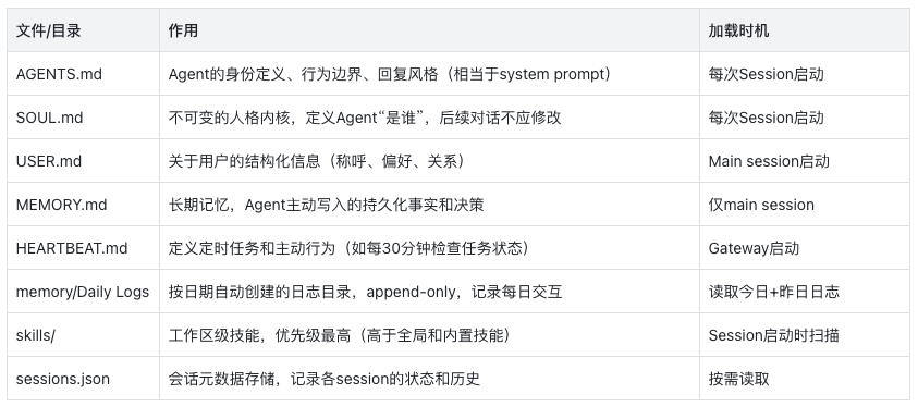 - MEMORY.md:可选的持久化文件,存储决策记录、用户偏好和长期事实。关键规则:仅在main/private session中加载,群组隔离session不会看到。
