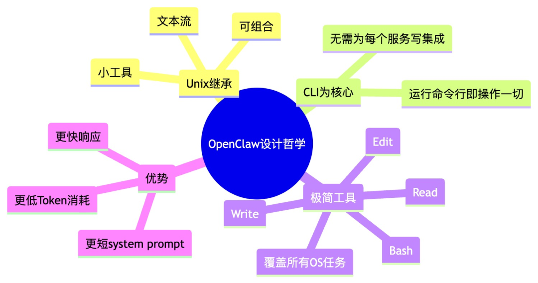 OpenClaw的设计直接继承自Unix哲学:小工具、可组合、文本流。创始人Peter Steinberger认为:“CLI才是智能体连接世界的终极接口。”——只要能运行命令行,就能操作一切,无需为每个服务单独写集成。