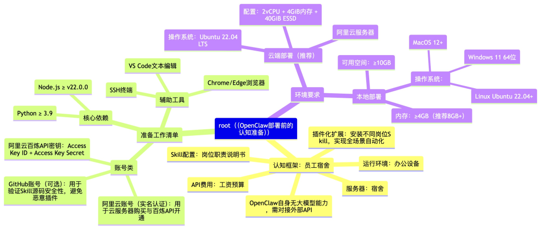 设备与环境要求方面云端部署推荐阿里云服务器Ubuntu 22.04 LTS,2vCPU+4GiB内存+40GiB ESSD,本地部署MacOS 12+/Linux Ubuntu 22.04+/Windows11 64位建议内存≥4GB可用空间≥10GB,核心依赖Node.js≥v22.0.0、Python≥3.9。