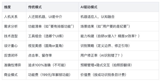 当按钮不再是核心产品经理的工作内容也将发生剧变,需求分析从功能清单转向场景结果,以前PM写需求文档关注的是我们要有一个排版功能,现在你得关注用户想要什么结果,用户要的是纪要而不是排版工具。