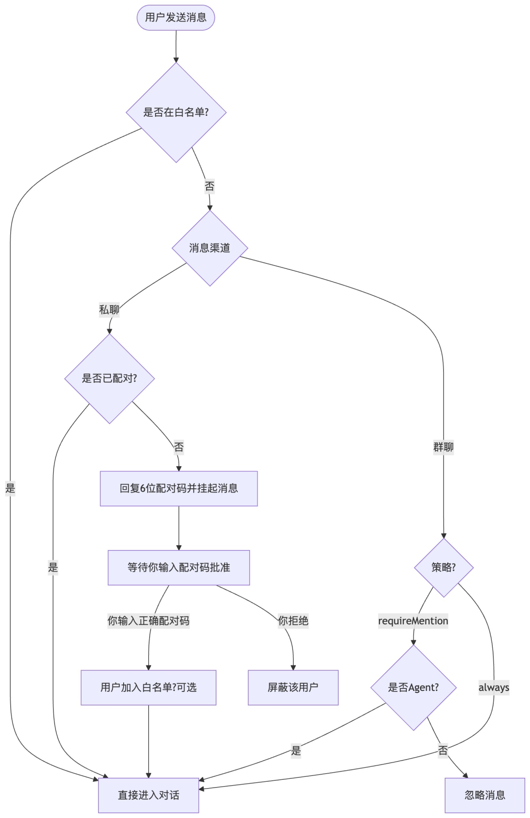 - 当陌生用户通过任意渠道发送私聊时,Agent自动回复一个6位一次性配对码,并将该用户的所有后续消息挂起,等待你批准。