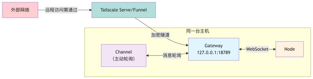 Gateway默认只绑定本地地址(localhost),所有流量在本地回环,默认不开放任何外网端口,天然安全。同一台机器上的Node直接连接本地Gateway;需要远程访问时,通过Tailscale Serve/Funnel等方式暴露,绝不直接暴露端口。