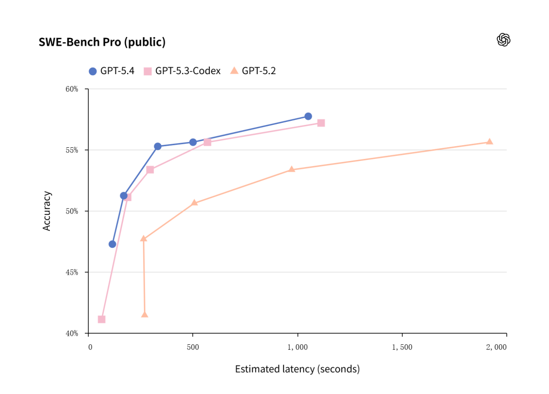 针对最受开发者关注的编码场景,GPT-5.4 保持了与 GPT-5.3-Codex 生成同等质量代码的能力,没有显著的提升。不过,新增加的“/fast”模式能够实现约 1.5倍 的 token 生成速度 。