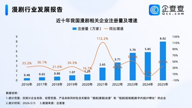 企查查数据显示,2025年新增注册漫剧相关企业8.02万家,同比增长37.1%。截至2026年2月5日,现存24.5万家,2026年已新增注册7307家。