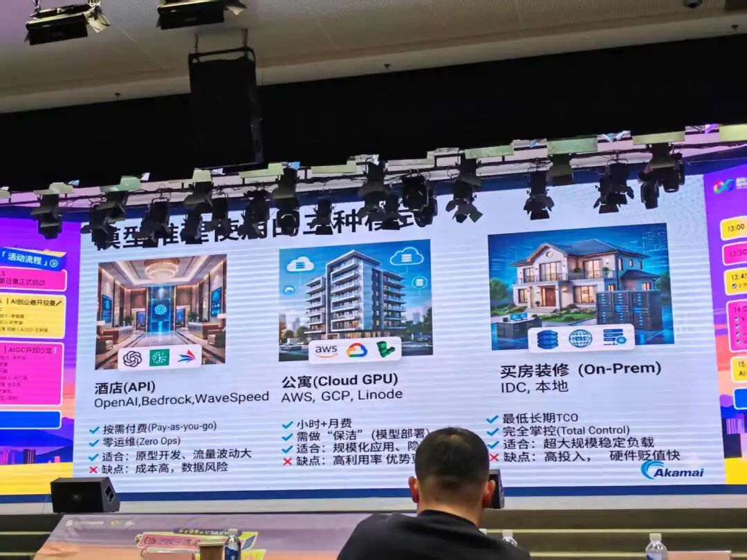 行业起量后,模型使用的经济性成为关注重点。云服务提供商Akamai张璐介绍,业界主要有三种部署模式:调用API、租用云GPU和自建服务器。