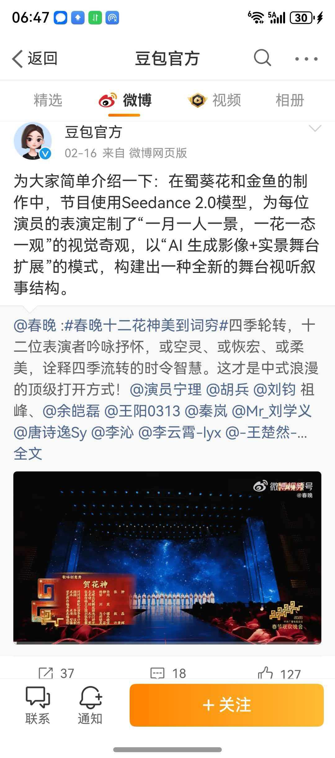 曾经需要下载专门APP、访问网页、输入复杂指令prompt才能使用的AI视频工具,在抖音、剪映等国民级应用中,实现了“拍同款”式的傻瓜操作。春节期间,个性化的AI拜年视频,成了潮流人士新年祝福的新方式。马年春晚,则是AI视频破圈的最高潮,字节跳动的Seedance 2.0模型参与《贺花神》等舞台视觉,让亿万观众直观感受到了中国AI视频生成的效果。