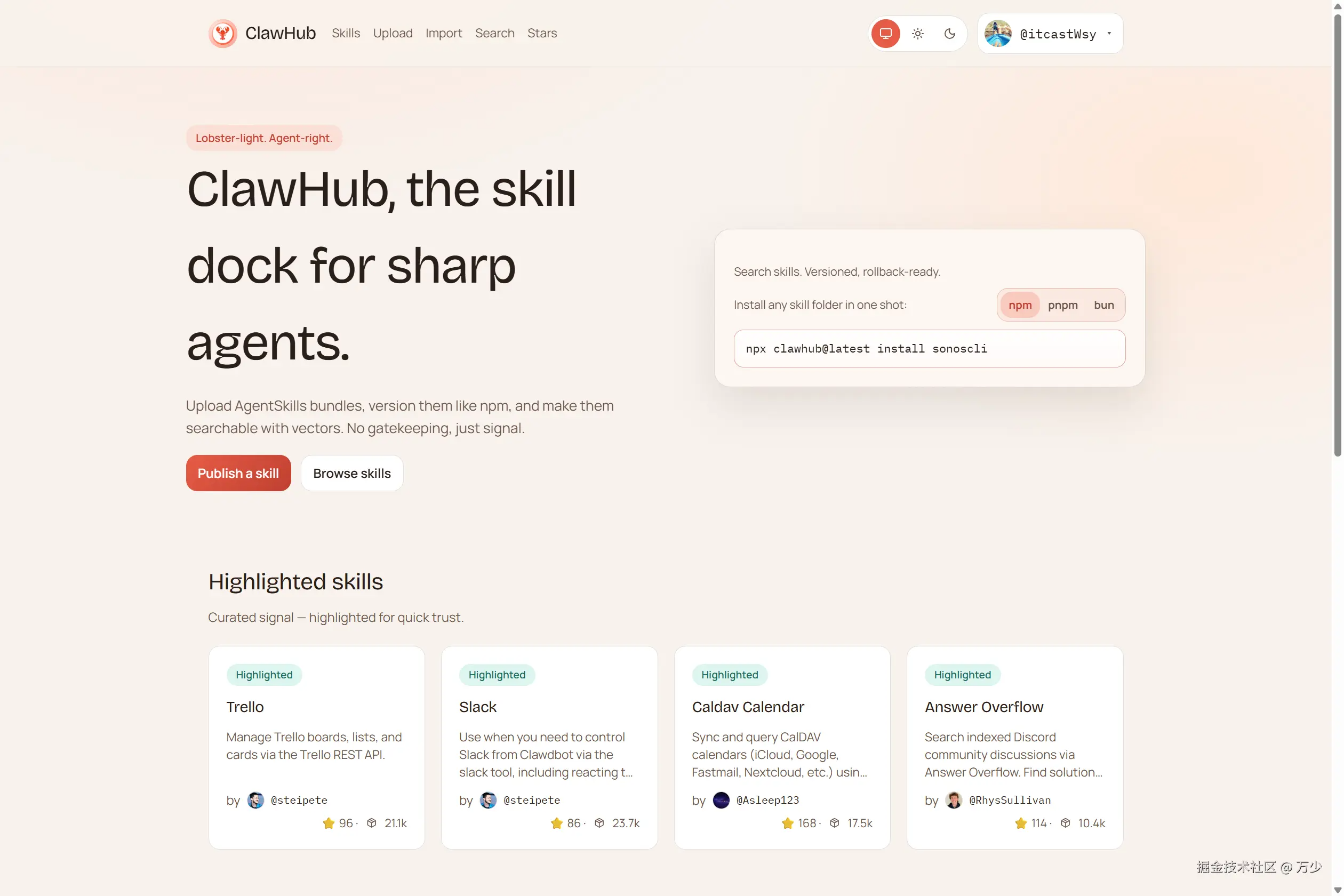 ClawHub 是 OpenClaw 官方用来管理 Skill 的网站,用户可以在这里找到很多实用的 Skill,也可以发布自己开发的 Skill。