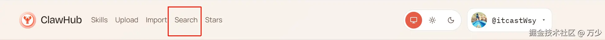 点击 ClawHub 网站顶部导航栏的”Search”链接,进入搜索 Skill 的界面。