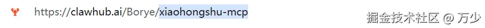 在浏览器的地址栏上直接复制 Skill 的名称”xiaohongshu-mcp”,这个标识符用于后续的安装和调用。