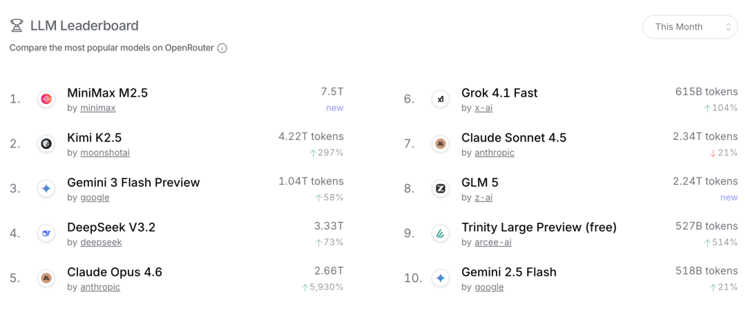 来自全球最大AI模型API聚合平台OpenRouter的数据显示,截至2026年2月28日,前十模型总Token消耗量已突破28.7万亿,其中中国模型贡献超过14.69万亿,单月Token调用占比首次过半。