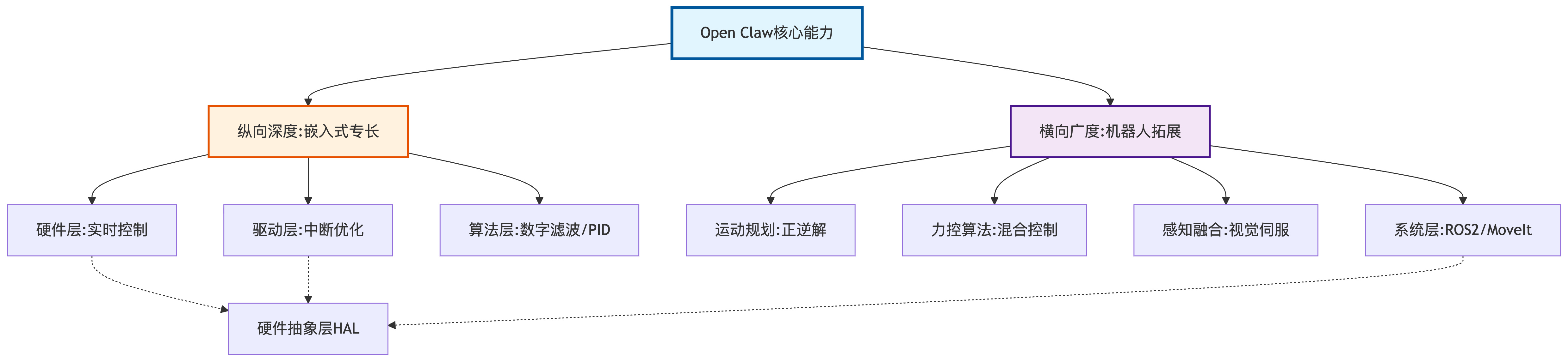 本文将论证三个核心观点:第一,Open Claw技术栈是嵌入式工程师切入机器人领域的最佳跳板,技能迁移成本低于传统路径65%;第二,能力进化遵循”硬件抽象-算法融合-系统协同”三阶模型,每个阶段都有明确的技能锚点;第三,职业突破需要构建T型能力结构——在嵌入式深度基础上,横向拓展机器人学、运动规划与感知融合能力。