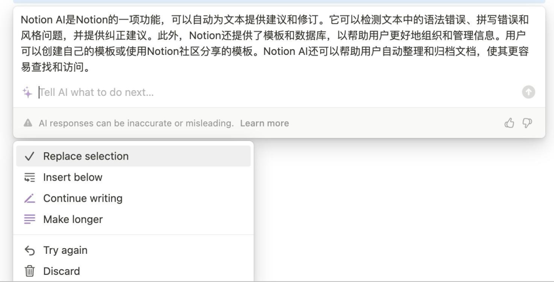 Notion AI在生成长文案后,底部的悬浮菜单提供的是:“Replace selection(替换选区)”、“Insert below(在下方插入)”、“Continue writing(继续写)”和“Make longer/shorter(调长/调短)”。它完全是在打辅助,而不是做主导。