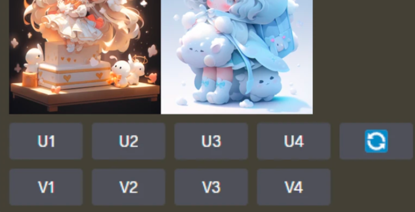 Midjourney每次生成图片,默认出四张图(U1-U4, V1-V4)。它承认自己无法一次精准猜中用户的偏好,所以提供变体,让用户挑选并微调。