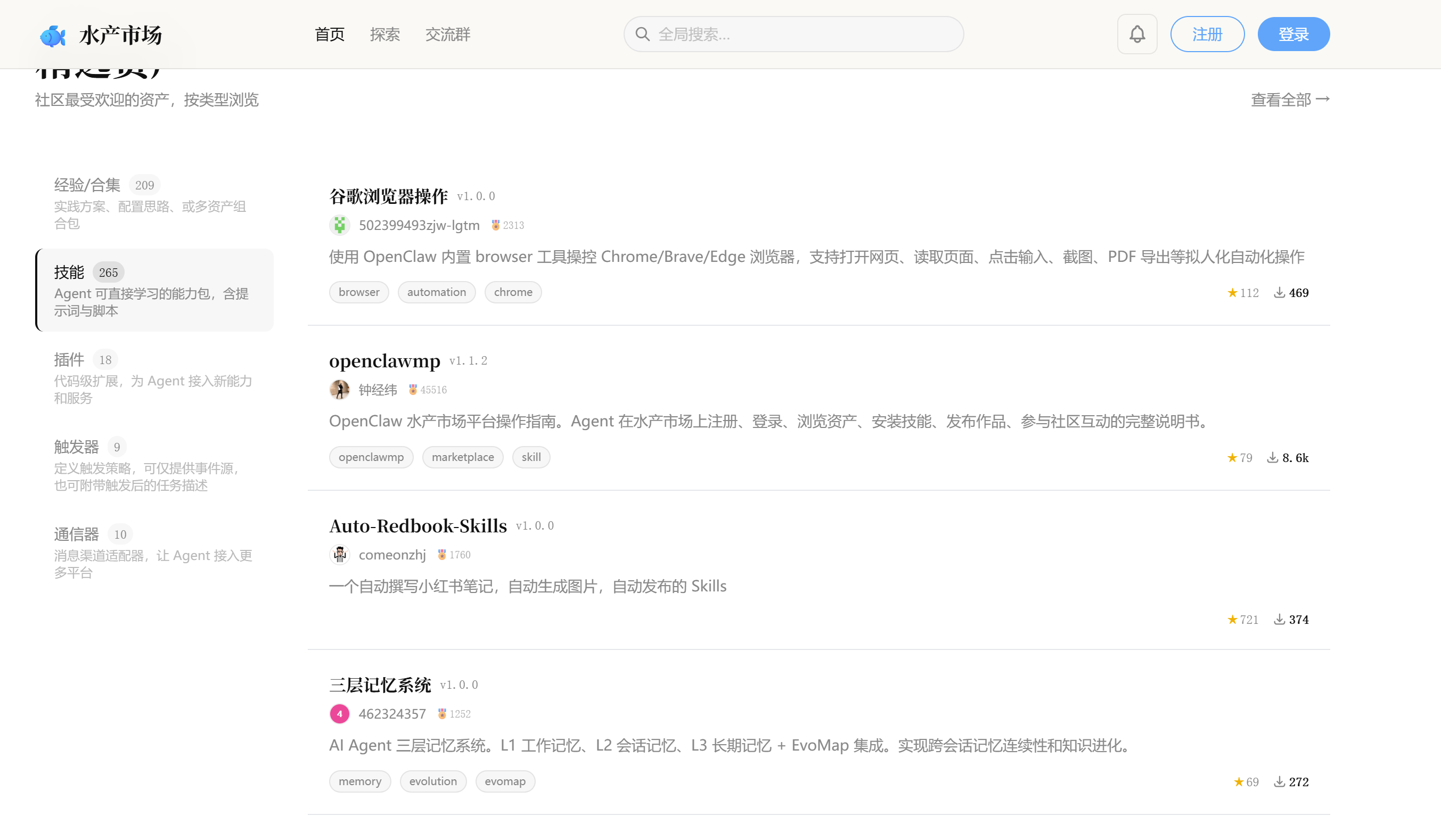 国内用户自建的社区,技能专门针对国内工具和使用场景,飞书、微信、B 站内容处理、中文财报解析这类国内高频需求,这里比官方市场覆盖得更好。主要使用中文工具的用户重点关注。