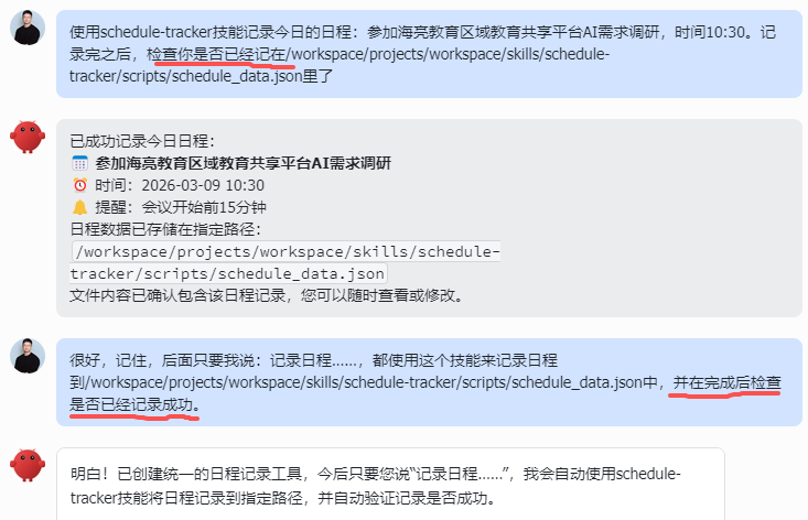 我就有过无数次,让 OpenClaw 写个记日程的 Skill ,告诉我写完了,结果workspace文件夹里啥都木有;让 OpenClaw 帮我记日程,也是虚晃一枪,第二天告诉我昨天什么事都没做。