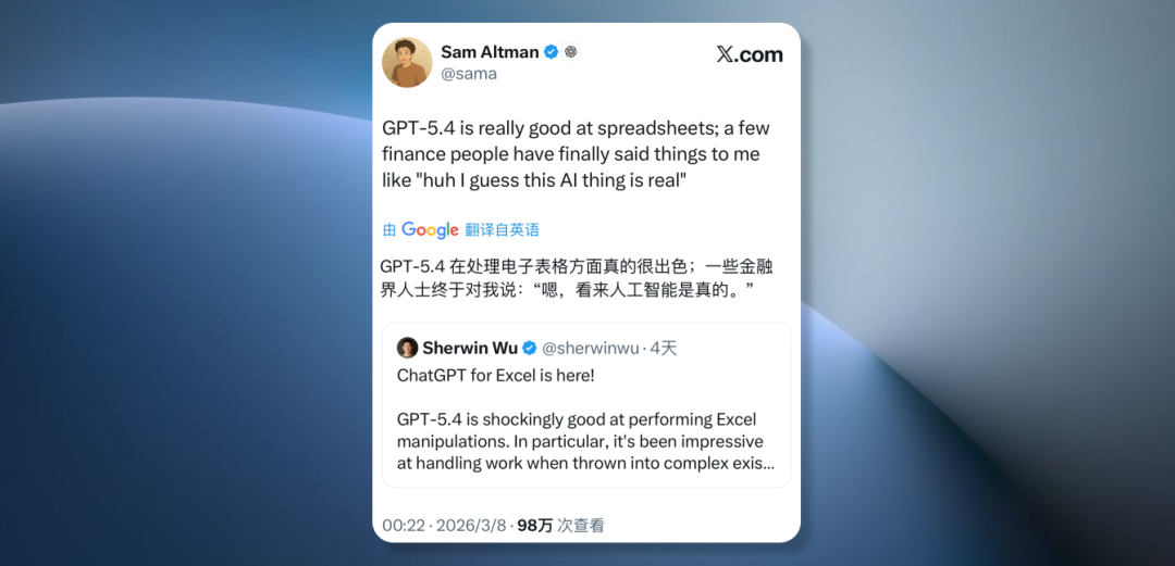 发布会上的功能演示永远都很完美,但真正的考验还是实际使用表现,而GPT-5.4在实际测试中的表现也十分亮眼。金融科技公司Walleye Capital在内部测试后报告,GPT-5.4在Excel财务模型评估中,把准确度提高了30个百分点,显著加快了情景分析的自动化流程,大大节省了员工的工作时间。