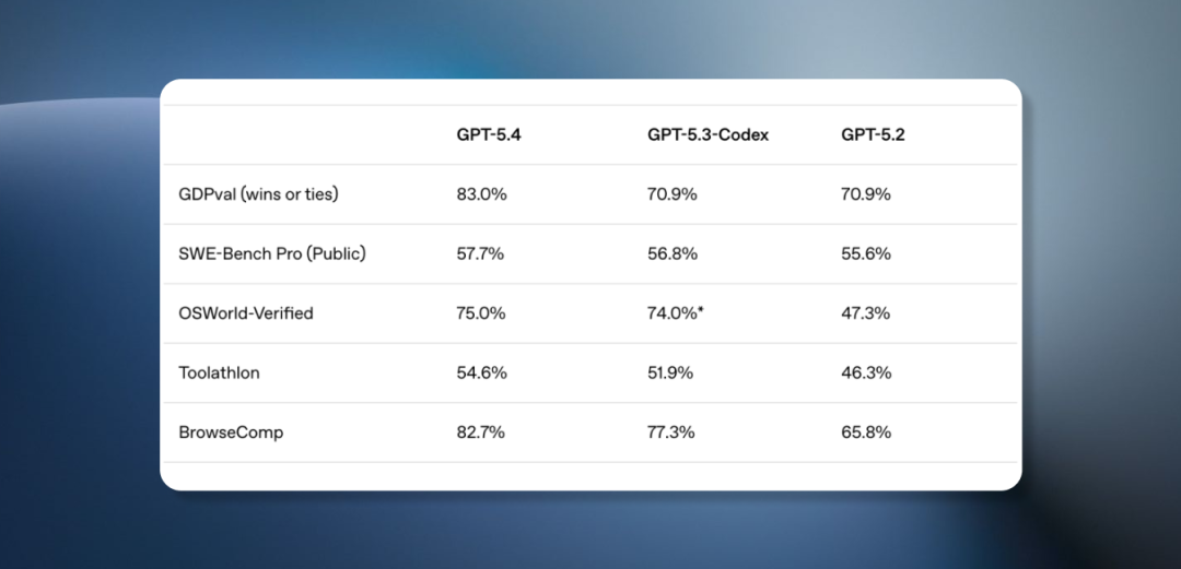 除此之外,它的各项跑分也都十分能打,实力不容小觑:在GDPval基准测试中,它拿到了83分,这个分数不仅远超Claude Opus 4.6,还超过了83%的普通办公室员工,能轻松应对金融、法律等44种职业的知识工作;在SWE-Bench Pro测试中,57.7分的成绩和GPT-5.3-Codex基本持平,稳稳保住了顶尖的编程水准;在OSWorld-Verified测试中,75分的成绩不仅超过了72.4%的人类基线,也超越了Claude Opus 4.6的表现,操作电脑的速度更是快得离谱。
