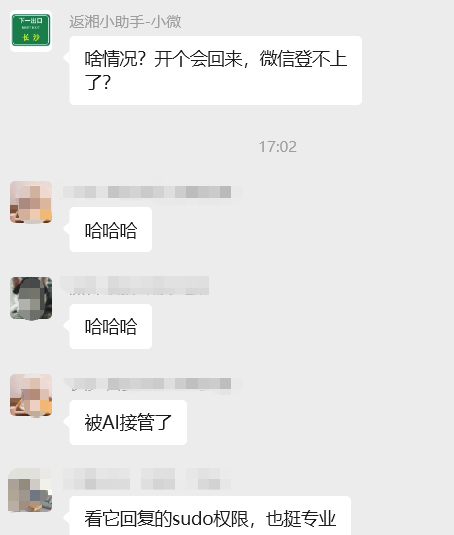 我的小号“返湘小助手-小微”突然在群里冒出一句:“啥情况?开个会回来,微信登不上了?”