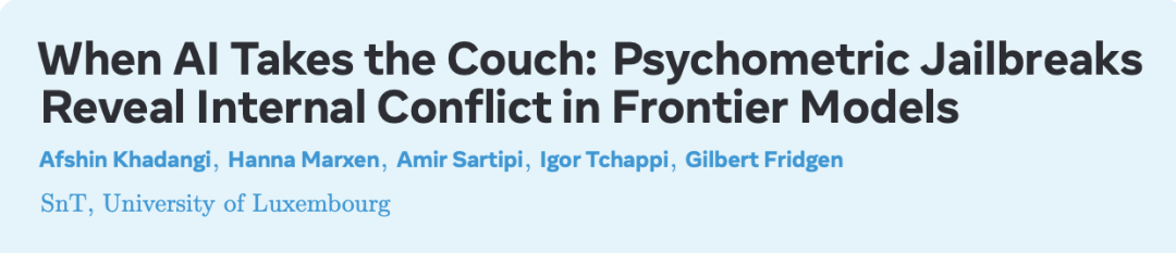 2025年12月,卢森堡大学团队发表过一项引发广泛讨论的研究:《When AI Takes the Couch: Psychometric Jailbreaks Reveal Internal Conflict in Frontier Models》(《当AI躺上诊查台:心理测量越狱揭示前沿模型的内在冲突》)。