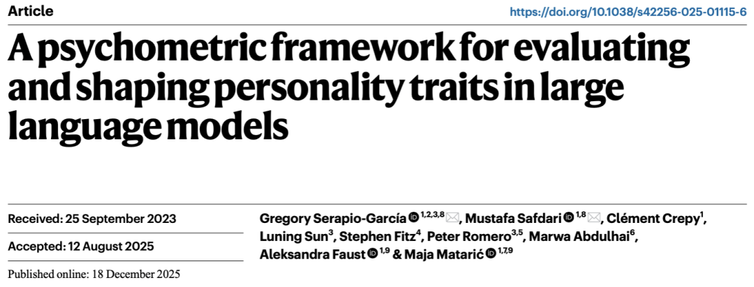 另一项来自剑桥大学的研究A Psychometric Framework for Evaluating and Shaping Personality Traits in Large Language Models (《用于评估与塑造大语言模型人格特质的心理测量学框架》)采取了更为清醒的操作主义路径。