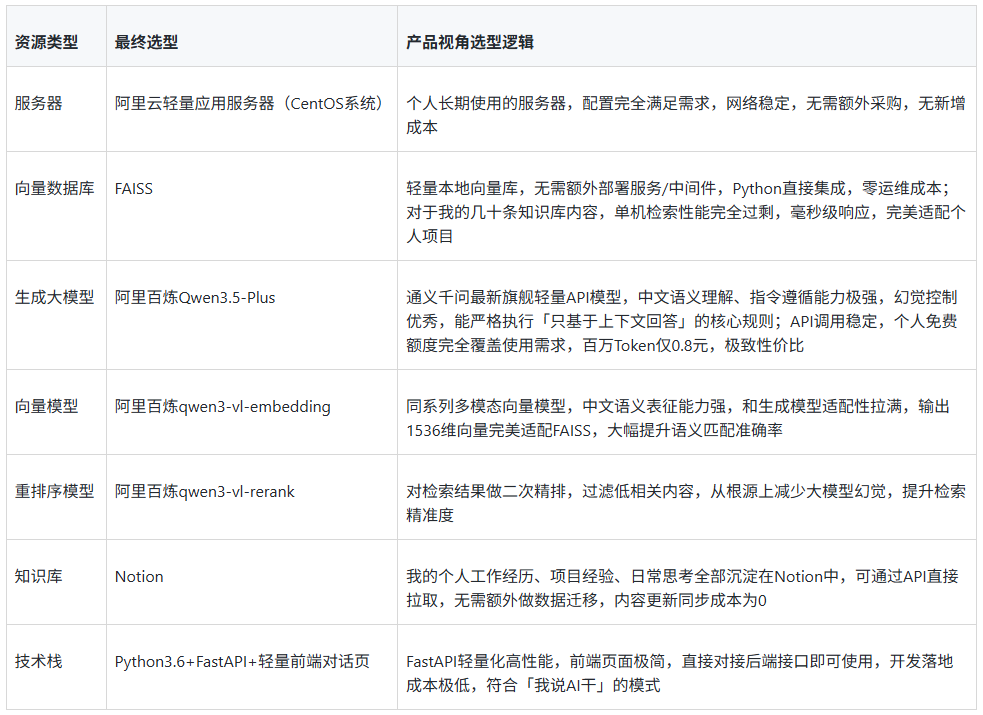 个人项目的核心选型原则是场景匹配优先、ROI最大化、无额外运维负担,所有选型都围绕「个人数字分身」这个垂直场景,拒绝盲目跟风技术热点,最终选型如下: